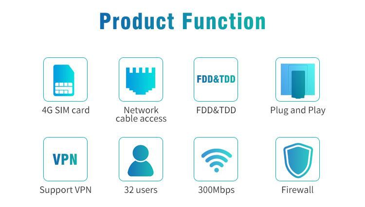 Це CAT 4G WiFi маршрутизатор швидкості передачі до 300 Мбіт / с, швидкість 4G до 150 Мбіт / с, TDD-LTE: 150 Мбіт / с DL / 50 Мбіт / с UL TD-SCDMA: 2,8 Мбіт / с DL / 2,2 Мбіт / с UL. Термінал може підтримувати три режими зв'язку: TDD FDD, WCDMA. Він підтримує доступ до Інтернету/робочий режим PPPoE, використовує sim-карту 4G, може підключатися до роботи модему, оскільки шлюзовий режим, оснащений інтерфейсом 4 LAN, може підключатися до інших Пристроїв одночасно. Легко підключитися і легко носити в руці Спільний доступ клієнта до 32 користувачів Wi-Fi, просто вставте SIM-карту, тоді можна буде насолоджуватися Wi-Fi з цим портативним маршрутизатором 4G LTE.