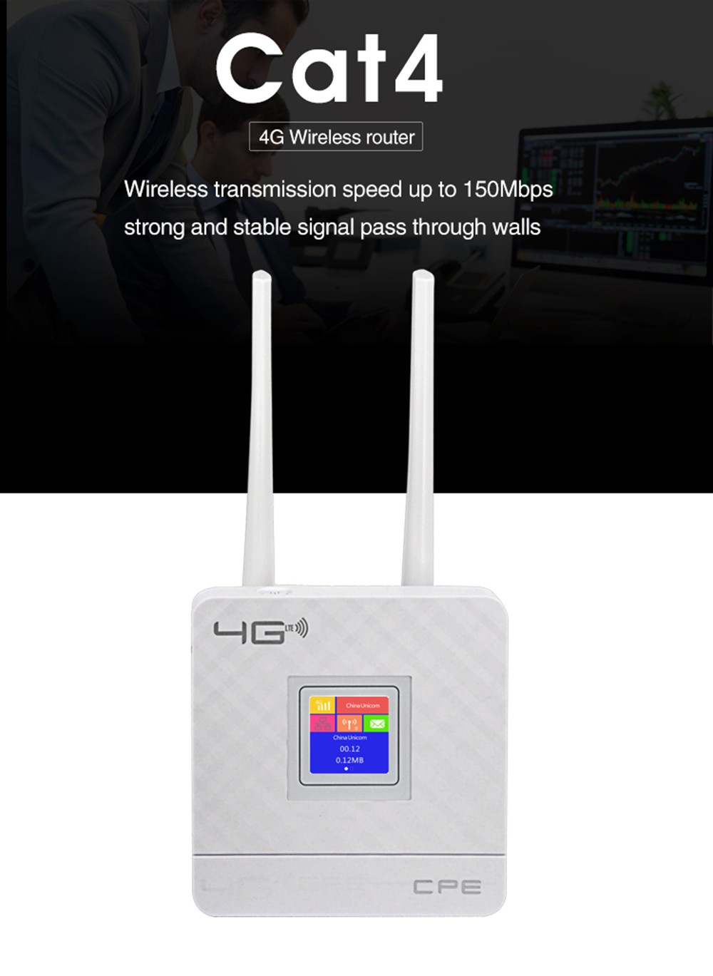 CPE903 - це бездротовий маршрутизатор 4G з слотом для sim-карт 4G та мережевим процесором MIPS, це рішення для бізнесу, дому, компанії, мережі Wi-Fi офісу. Він сумісний зі стандартом IEEE 802.11b/g/n, швидкість передачі даних досягає 300 Мбіт/с. З подвійною зовнішньою антеною сигнал Wi-Fi є більш стабільним і більш дальнім. Він підтримує 10 користувачів Wi-Fi одночасно.